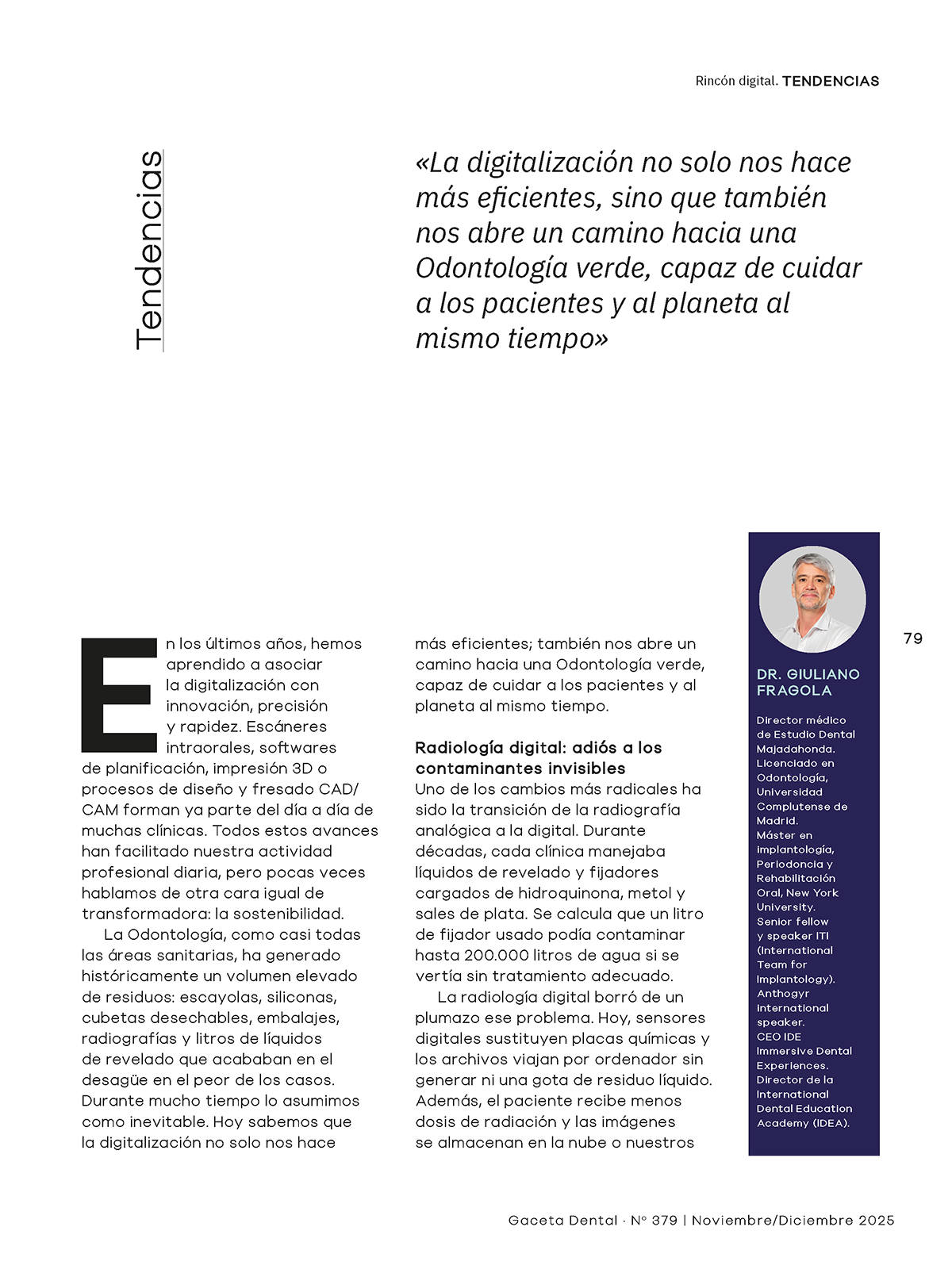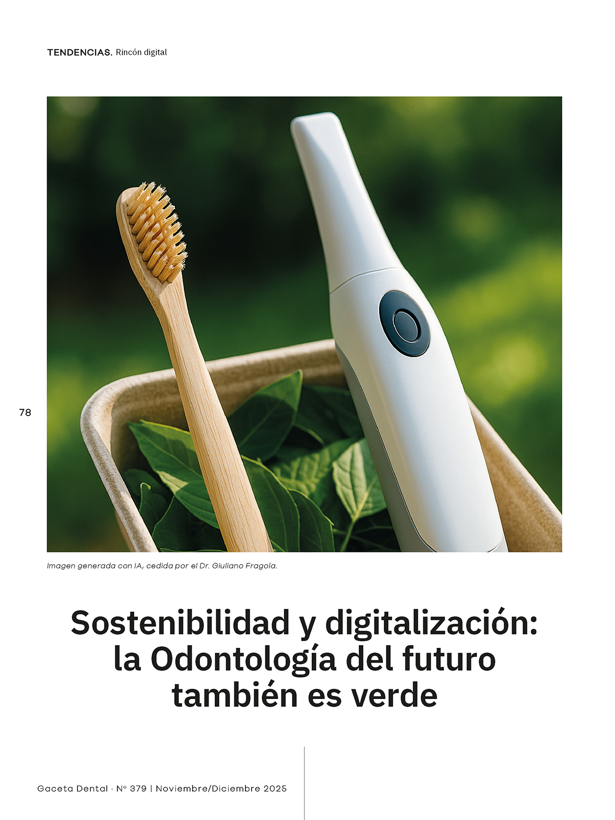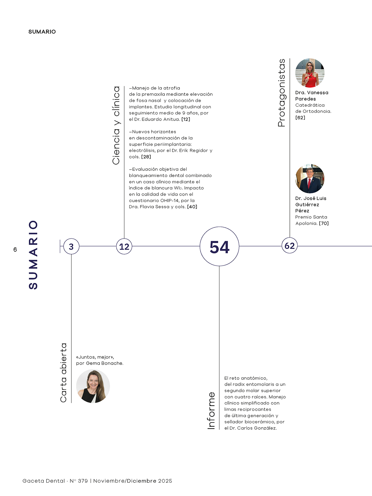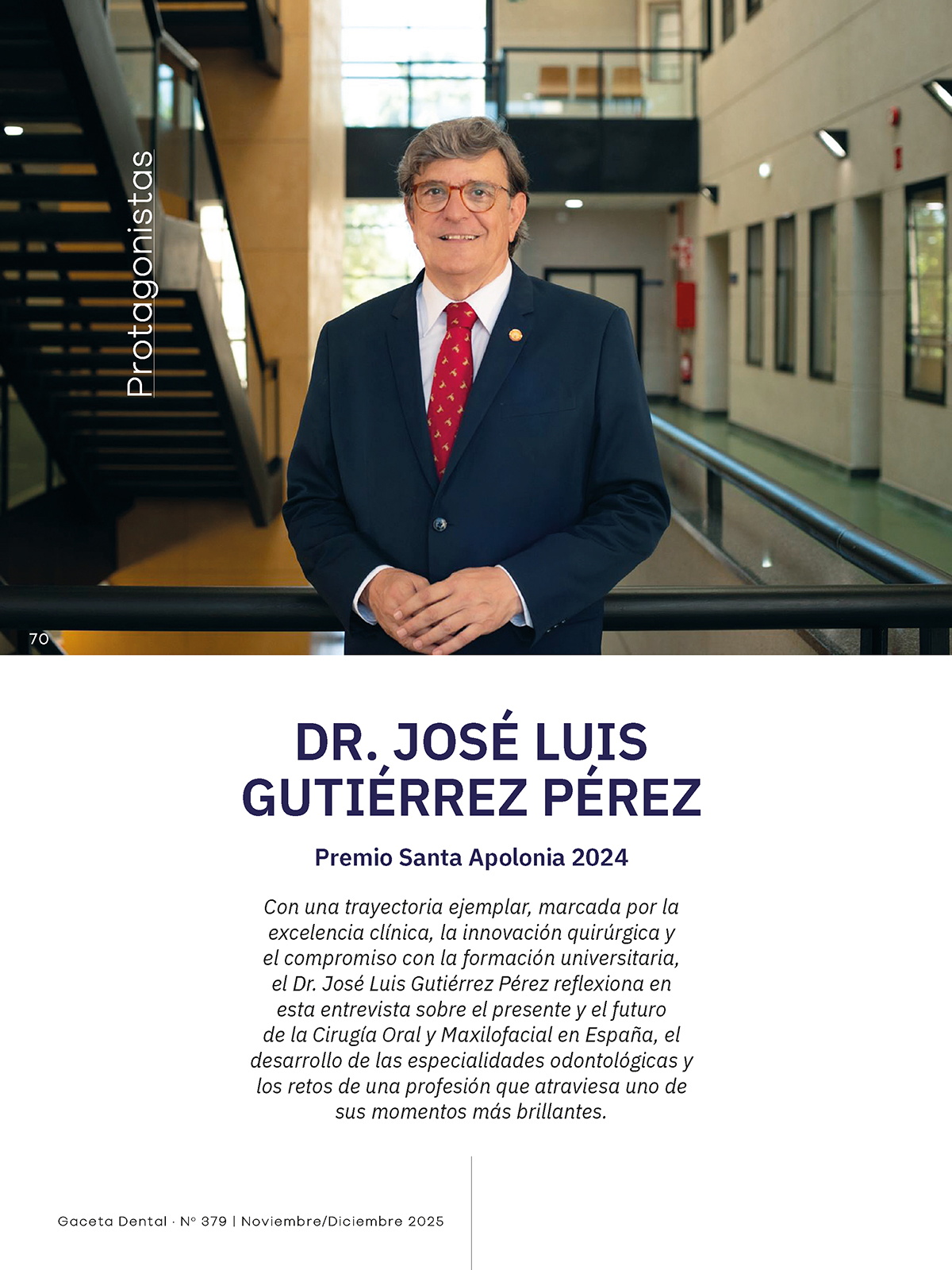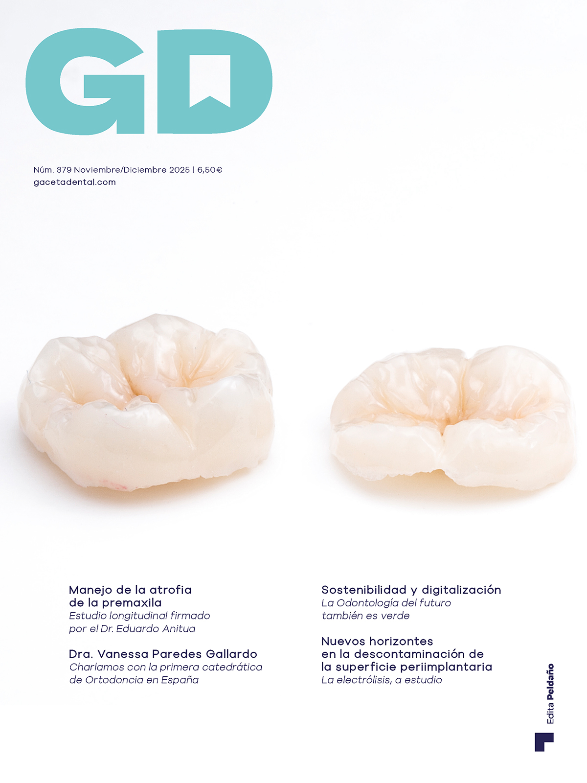 El número de noviembre/diciembre de Gaceta Dental reúne una serie de casos clínicos y artículos científicos firmados por los Dres. Eduardo Anitua, Erik Regidor y Flavia Sessa. También abordamos la sostenibilidad y digitalización en Odontología de la mano del Dr. Giuliano Fragola, y hablamos con la Dra. Vanessa Paredes Gallardo, Catedrática de Ortodoncia, y el Dr. José Luis Gutiérrez Pérez, Premio Santa Apolonia 2024.