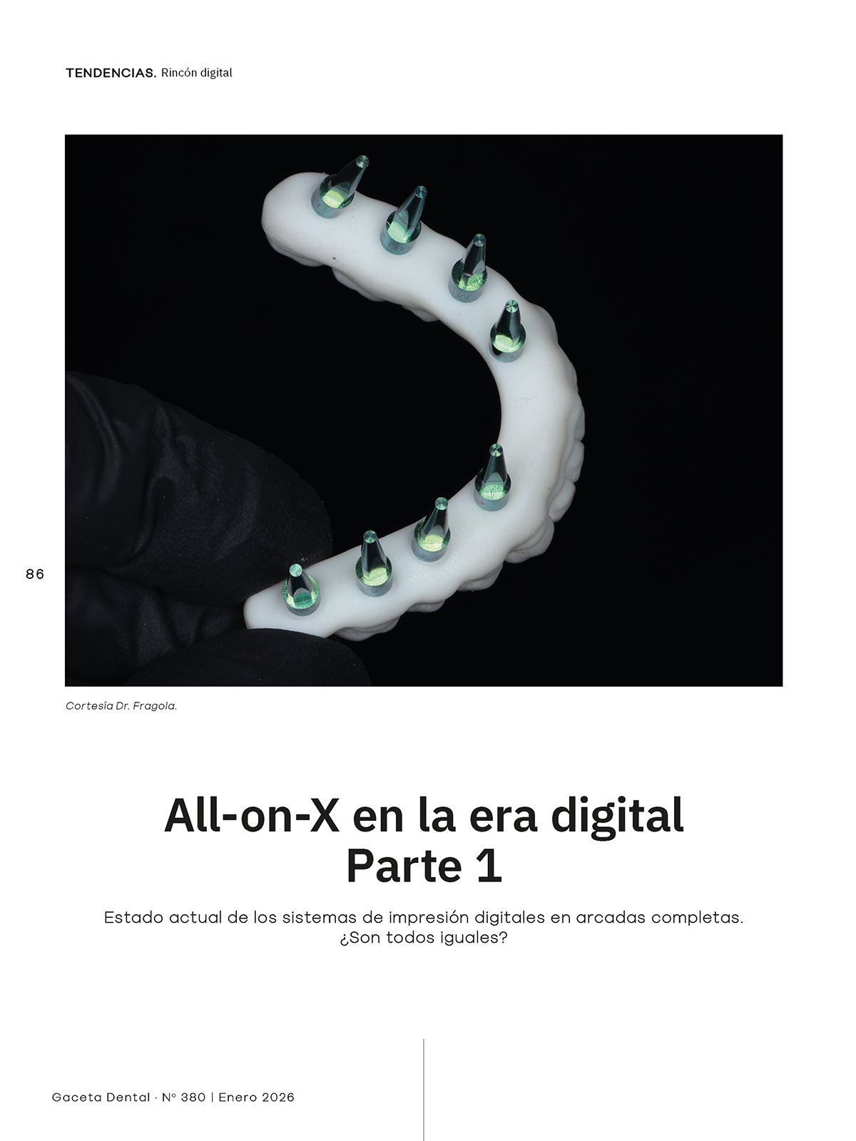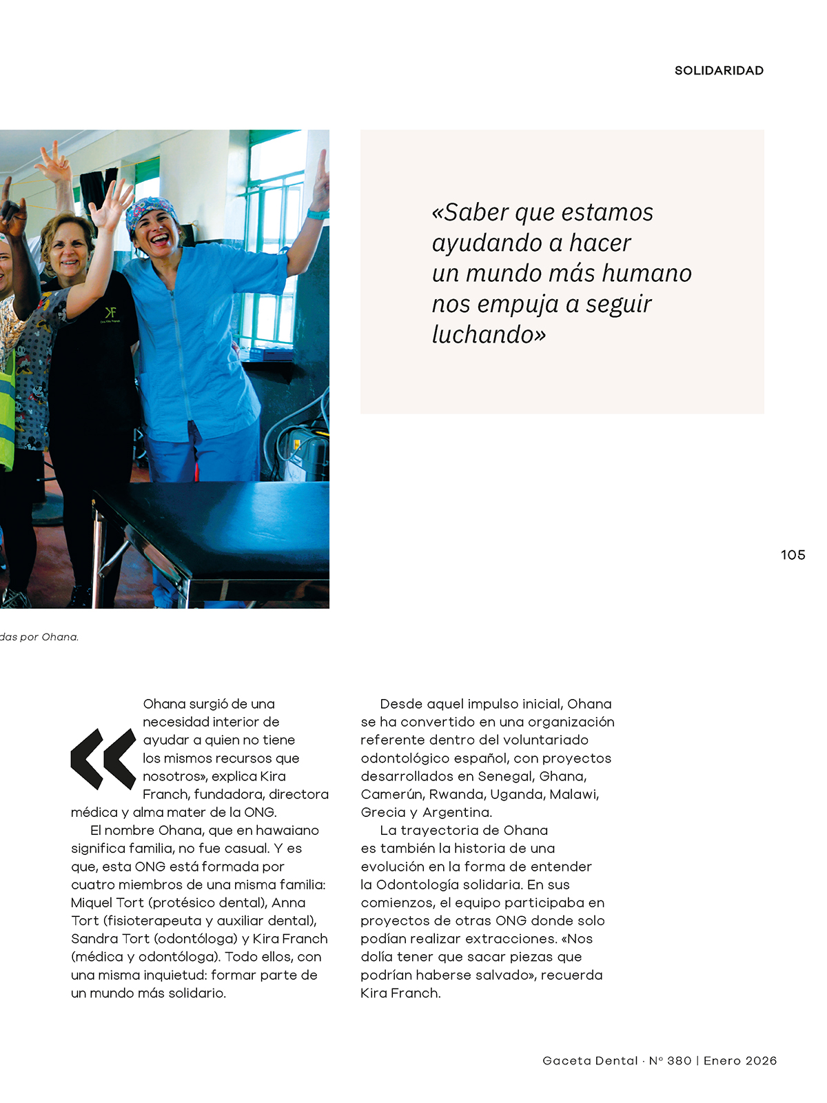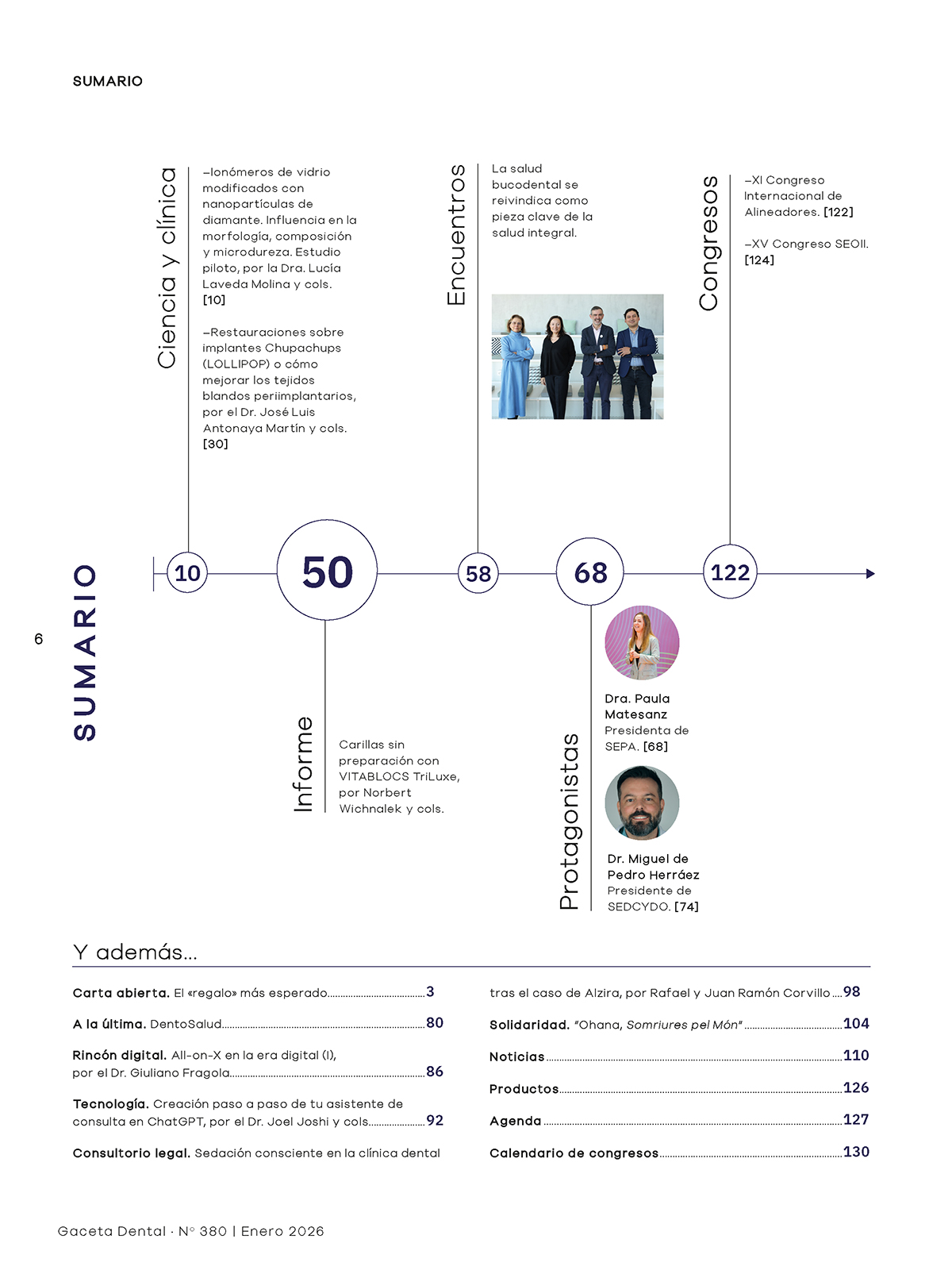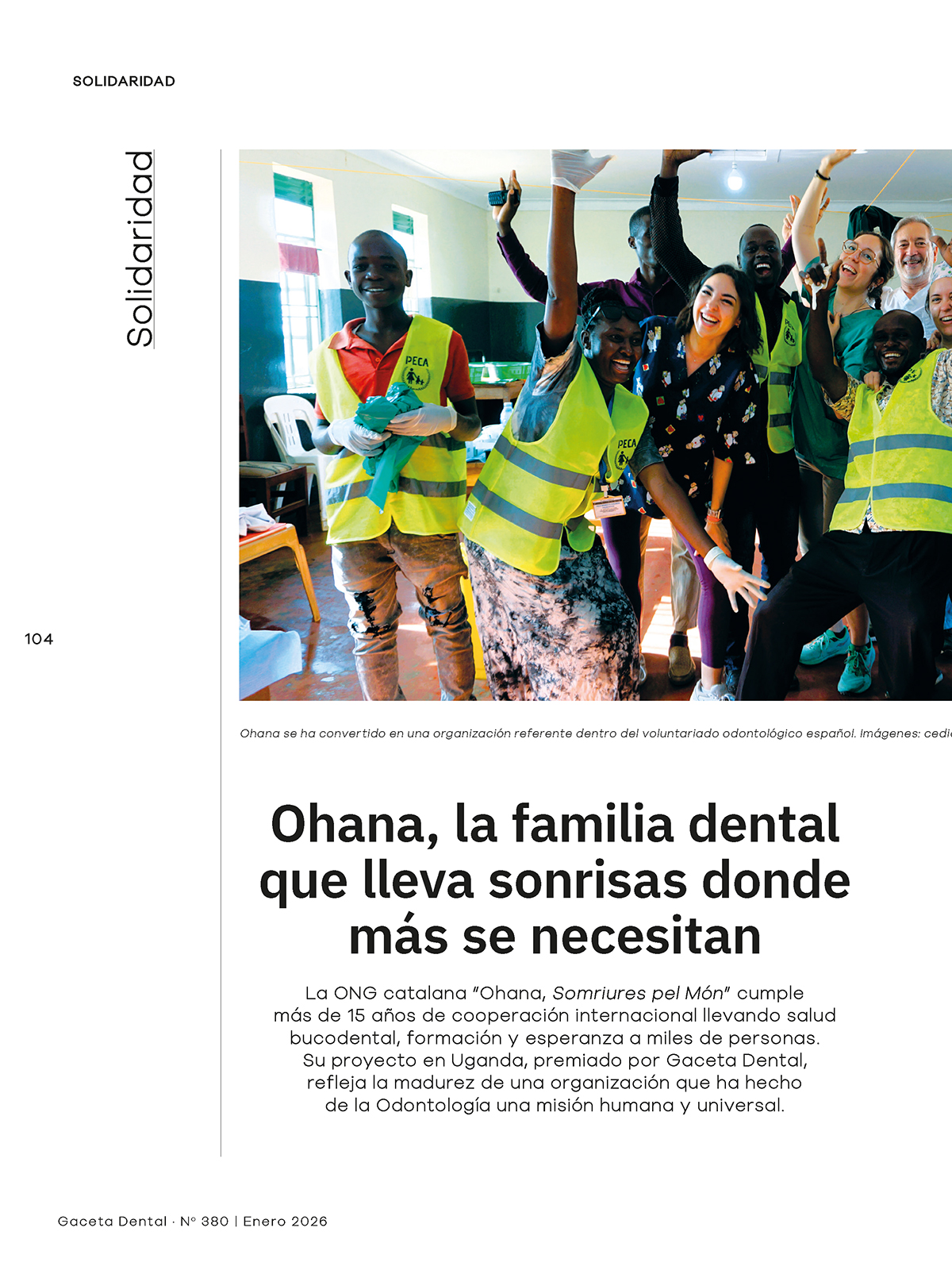 El número 380 de Gaceta Dental arranca el año con los casos clínicos de los Dres. Lucía Laveda Molina y José Luis Antonaya Martín. También, este nuevo número aborda la salud bucodental como pieza clave de la salud integral. Charlamos con la Dra. Paula Matesanz, presidenta de SEPA, y el Dr. Miguel de Pedro Herráez, presidente de SEDCYDO. Conocemos la solidaridad dental de la mano de Ohana, Somriures pel Món y abordamos la sedación consciente en la clínica dental.