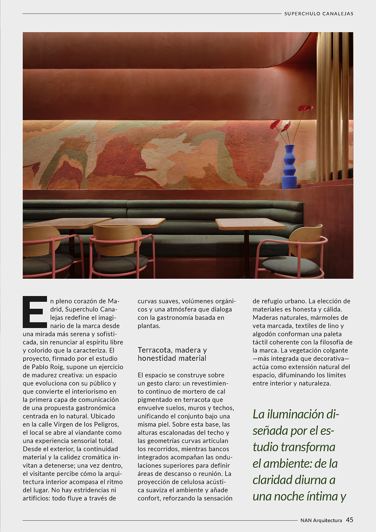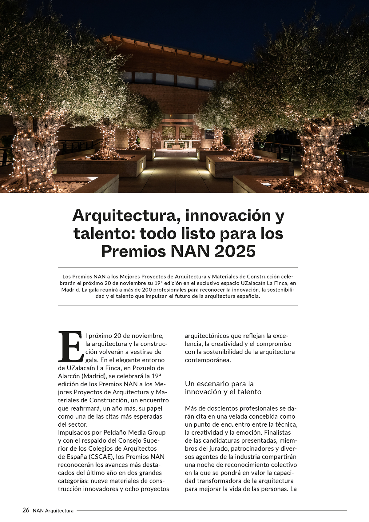Este número de NAN Arquitectura incluye una entrevista a GCA Architects sobre sostenibilidad y medición del impacto, un especial dedicado a la climatización y la resiliencia ante el cambio climático, y dos proyectos de interiorismo que transforman la experiencia gastronómica: Superchulo Canalejas y Xipe. Además, repasamos Espacio NAN Rehabilitación, las ferias de diseño de otoño y toda la actualidad previa a los Premios NAN 2025.