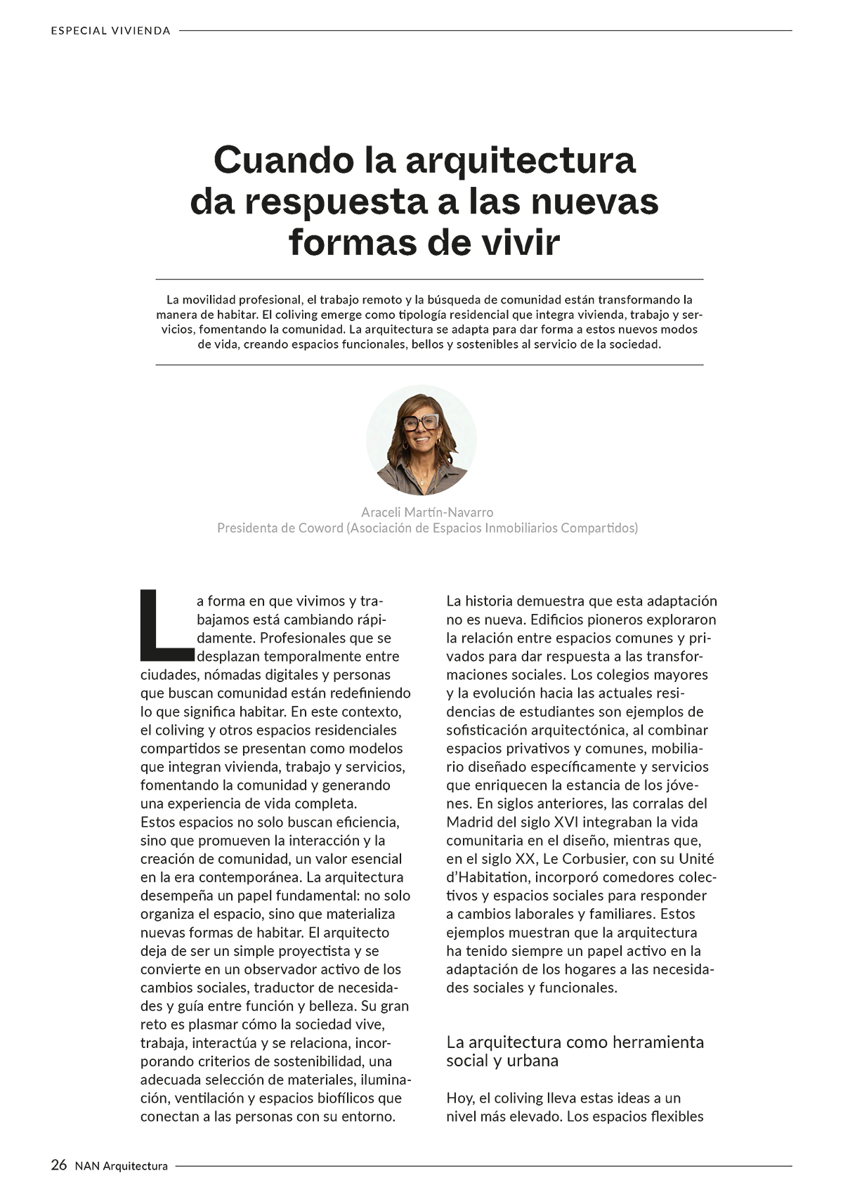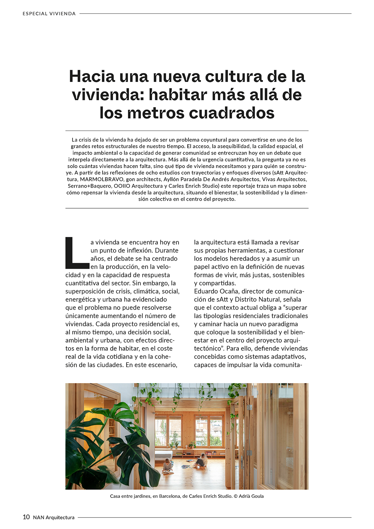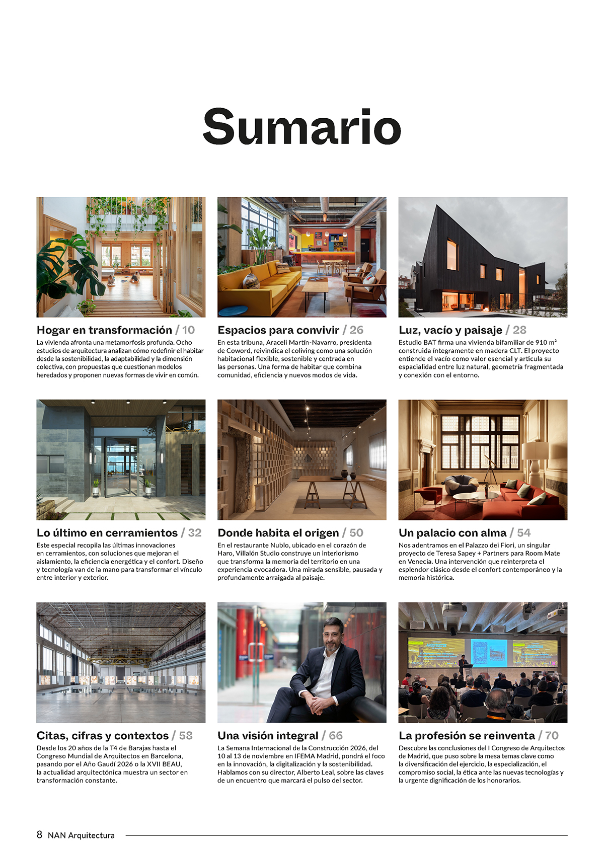 Este número se articula en torno a la vivienda, con un reportaje central que reúne la mirada de varios estudios sobre nuevas formas de habitar, diferentes proyectos residenciales y una tribuna dedicada a los modelos habitacionales colectivos como el coliving. Se incluye también un catálogo de cerramientos que presenta soluciones actuales para mejorar el confort, la eficiencia energética y la relación entre interior y exterior. El contenido se completa con dos proyectos de interiorismo: la intervención de Villalón Studio en el restaurante Nublo, vinculada a la memoria del territorio, y el Palazzo dei Fiori de Teresa Sapey + Partners en Venecia, una reinterpretación contemporánea del patrimonio histórico.